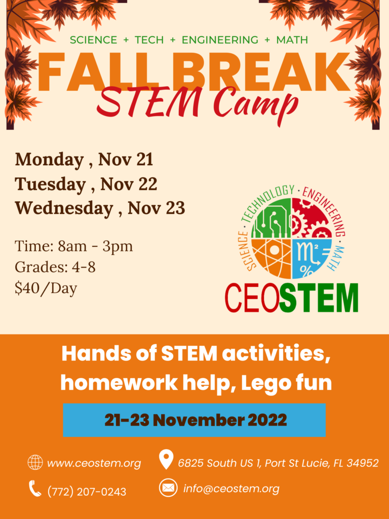 When school’s out, Camp CEOSTEM is IN! Experience the wonders of Fall through interactive science camps at the CEOSTEM Center in Port Saint Lucie! For young scientists grades 4-8, each exciting mini camp offers hands-on exploration of a variety of STEM topics. The days are packed with engaging lessons, exciting labs, crafts and outdoor activities led by our expert Science Educators. Safety guidelines and heightened cleanliness procedures are in place.